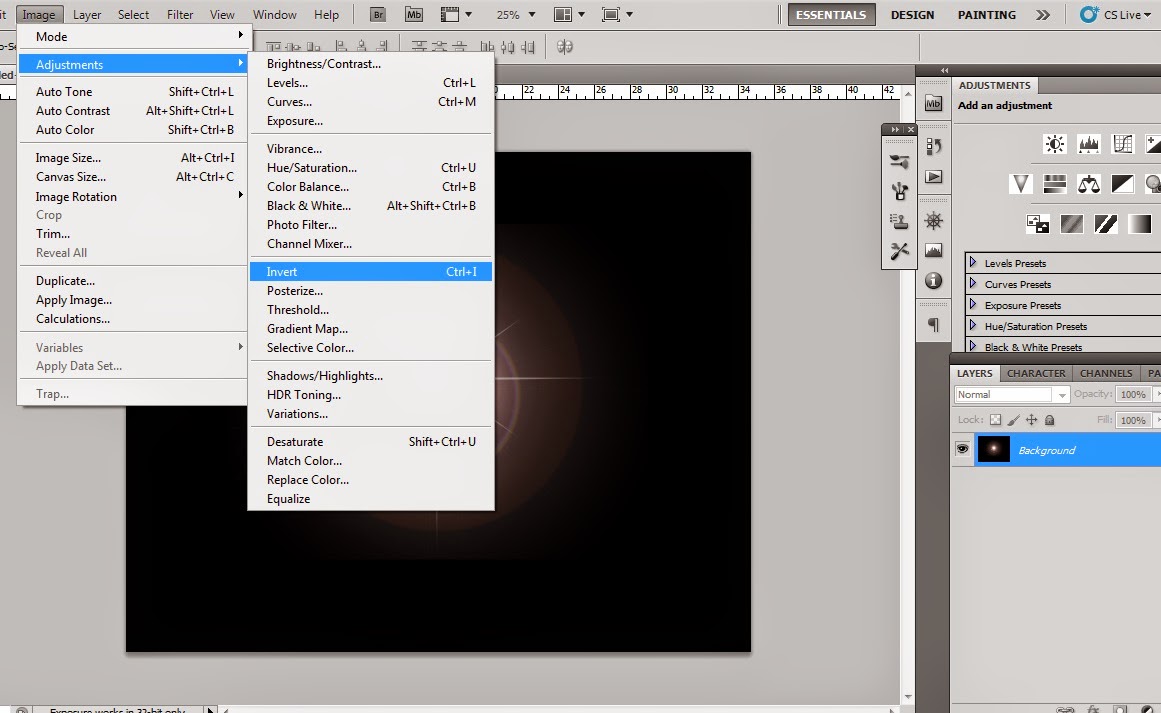 - Go to Image->Adjustments->Invert.